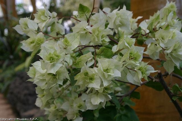 白にピンクが入る花(苞)を咲かせ、半ツル性樹形の品種。