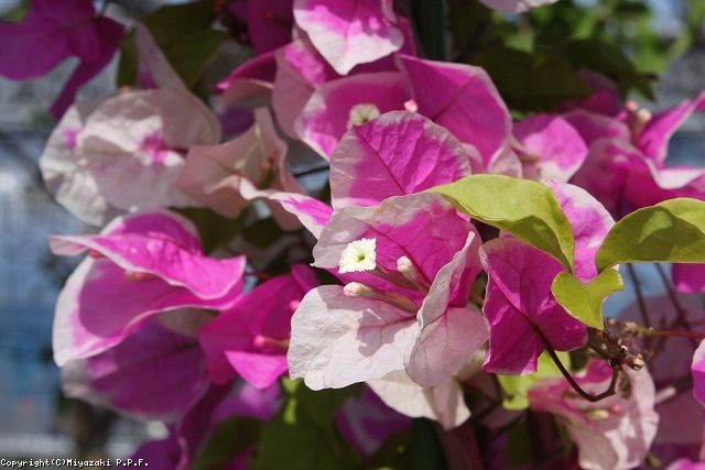 白とピンクが不規則に混じる花(苞)を咲かせ、半ツル性樹形の品種。