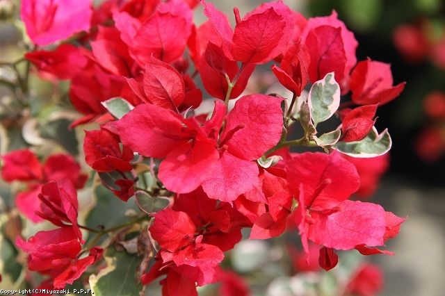赤花の斑入り品種で、大きめ葉にクリーム色の斑が入る。斑入り品種ではあるが、葉の変形や成長の遅れは見られず、緑葉品種と変わらない生育を見せる。