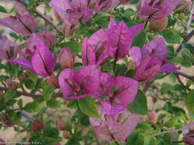 ややくすんだ赤紫の花(苞)を咲かせ、樹木性樹形の品種。