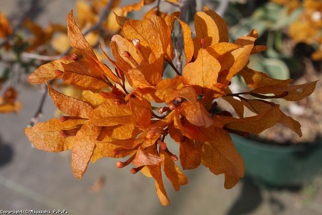 イエロー花(苞)を咲かせ、ツル性と樹木性と中間型樹形の品種。