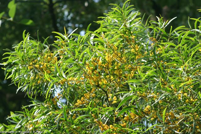 アカシアの仲間で香りのある黄色い花を咲かせます。花は初夏5月中旬から6月下旬にかけて香りのある黄金色の花を付けます。明治末期ごろ、防風林として台湾から沖縄に渡来たと言われています。