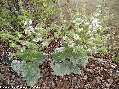 毛に覆われ白くなっている葉が特徴のサルビアで、シルバーセージとも呼ばれる。葉は手のひらよりも大きくなり、株は直径が30cm以上になる。この特徴的な草姿を庭のアクセントに用いたりするが、蒸れに弱いため、雨が激しくあたる日当たりでは夏場に枯れてしまうことがある。