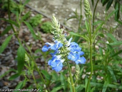 ボッグセージとも呼ばれる水色の花を咲かせる宿根サルビア。植物全体を見てもここまではっきりとした水色を咲かせる植物は珍しい。また開花期間が長く、多くの植物が夏バテし花が少なくなる宮崎の真夏でさえ、花を咲かせ続ける。草丈は150cm程度で水色の花が夏風になびく様は涼しげである。生育旺盛で栽培は容易だが、旺盛すぎて蔓延ってしまう可能性もあり、庭植えする場合は、この点を気にとめておいた方が良い。