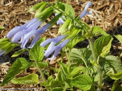 「サルビア ガラニチカ」の一品種でガクは黄緑、花は薄紫の品種である。開花期、育てやすさは普通のガラニチカの変わらないが、背丈が普通種の半分程度(50cm程度)で収まることが多い。