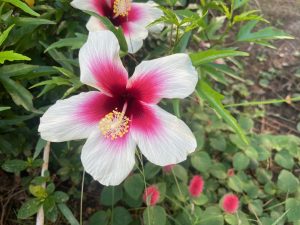 (左上:ハイビスカス‘パープルレインボー’ 右上:ハイビスカス‘フィジアンホワイト’