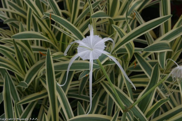 葉に白斑が入り花が咲かなくても十分に鑑賞できるので、夏期の花壇、コンテナに利用したい種類である。耐寒性はヒメノカリスより劣るようであるが、秋に掘り上げて室内で管理するほうが安全である。