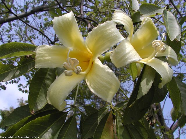 パラボラチョは現地で呼ばれている名前で、酔いどれの木の意。これは幹がトックリ状に肥大することからこう呼ばれている。宮崎では青島亜熱帯植物園に昭和40年に種で導入され、今では、10?15mに成長し夏から秋にかけて百合状の淡い黄色の花を咲かせる。、翌春には実を付ける。この実は綿が詰まっており、枕などの詰め物に利用されている。幹の色は淡黄緑色でる、仲間の赤花種の幹色は濃緑である。なお、赤花種はあまり幹が肥大しない。