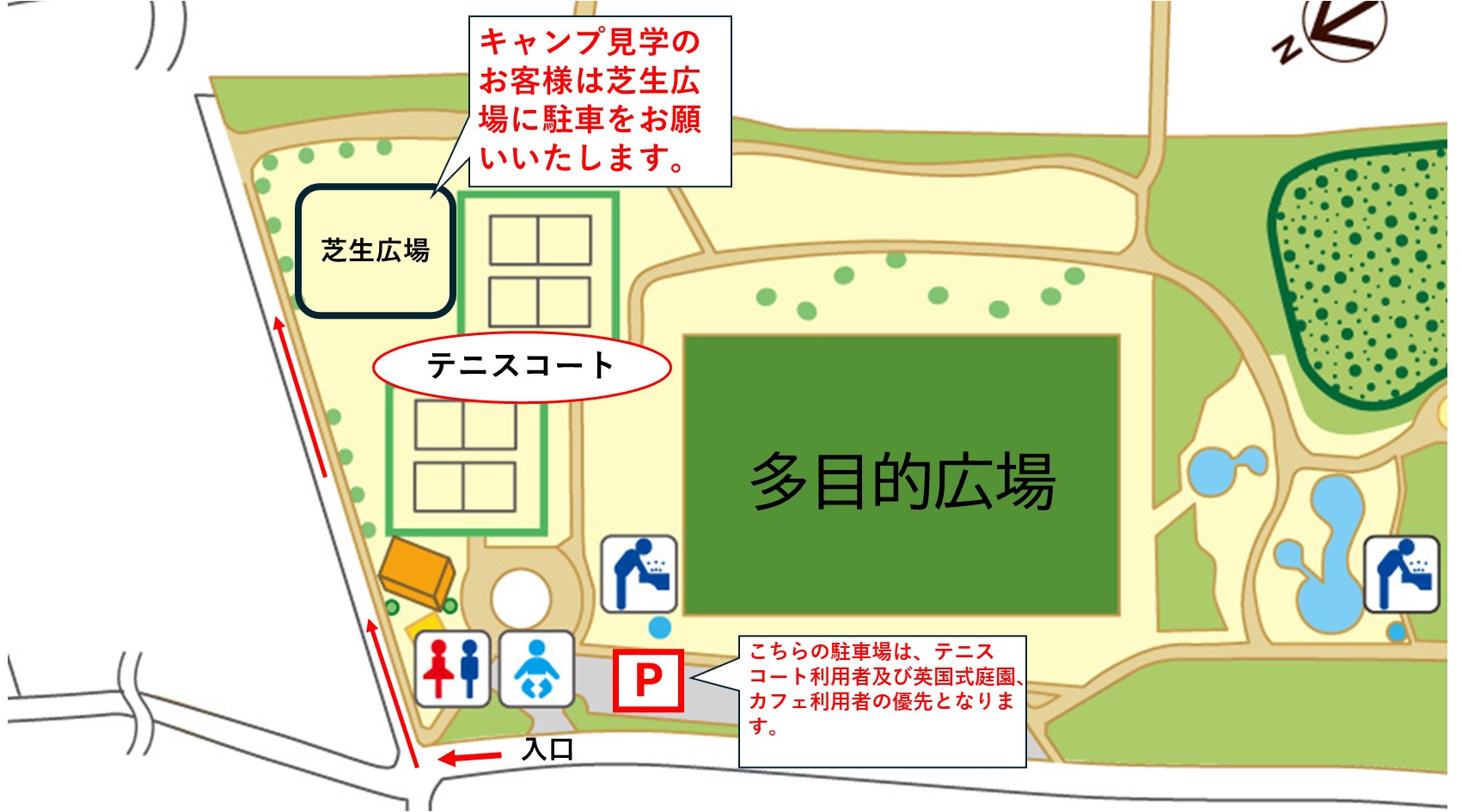 キャンプ見学の方は、テニスコート北側の芝生広場への駐車をお願いいたします。